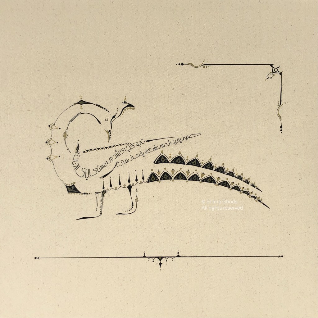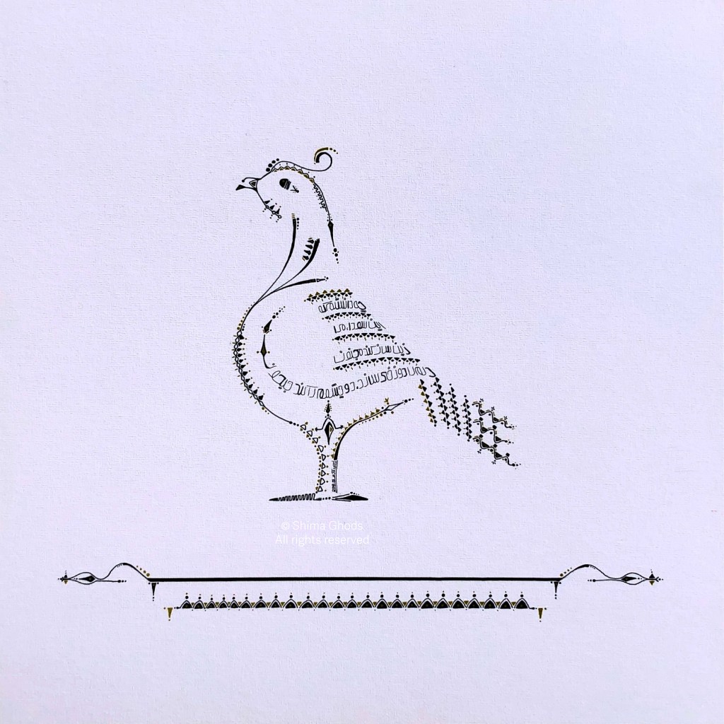 “A bird drawn in silence—composed of Persian letters, this piece captures the delicate rhythm between poetry and form. It invites the viewer to listen with their eyes, and read with their soul.”